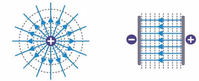 An electric field is a bit different because in order to interact with the field you need to use what is commonly referred to by physicists as a test charge. In an electric field, a test charge is analogous to the ball in the gravitational field. If a test charge is placed in an electric field, it will move just like the ball moves in a gravitational field because the electric field interacts with the charge of the test charge in much the same way that gravity interacted with the mass of the ball in the previous example. An electric field is produced around any source of electric charge. Just as a ball can have different amounts of mass depending on the type of ball (baseball, basketball, etc…), a test charge can have different amounts of charge depending on the source. The unit used to measure the amount of charge in a test charge is the coulomb (C), akin to the unit of mass used for the ball, which is kilograms (kg). Another difference between electric and gravitational fields is that an object with mass always experiences a force in the direction of the gravitational field (i.e., down toward the floor for any object near the Earth’s surface). On the other hand, for an object with charge in an electric field, the direction of the force depends on whether the charge is negative or positive. Since we know opposites attract, a positive test charge will move toward the negative side of the electric field. Also, the shape of the field depends on the shape of the object producing the field. If you look at Figure 2 below, you will notice that a point charge produces a field that emanates radially from the point, whereas the two parallel plates that have charges placed on them produce a uniform field between them. As you may have noticed, the two parallel plates more closely resemble the uniform gravitational field from Figure 1, with the main difference being that the electric field can exist in any direction — unlike the gravitational field, which only moves down toward the Earth.